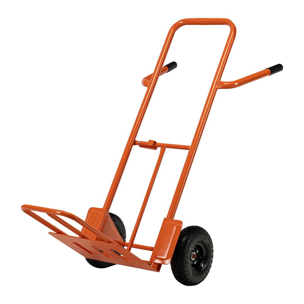 - Удобная транспортировка груза — пневматические колеса с камерами, резиновыми шинами и 2 шарикоподшипниками в каждом гасят вибрации и обеспечивают плавность хода.