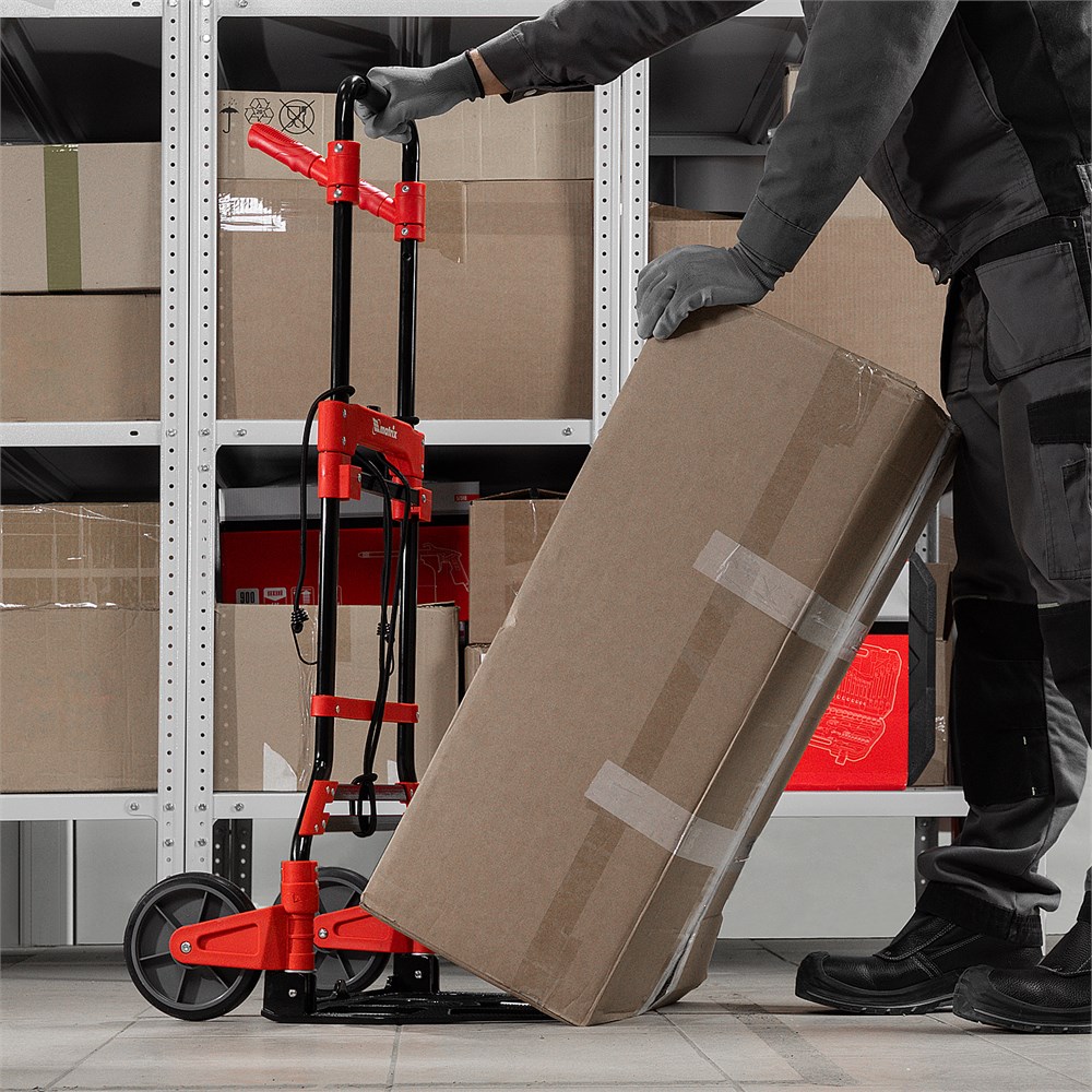 - Надежное размещение груза — крепкие багажные резинки прочно фиксируют его на платформе. Прочная конструкция — стальная рама выдерживает высокие нагрузки без риска деформации. Максимально удобная эксплуатация — дополнительные рукоятки облегчают транспортировку груза. Удобное хранение и транспортировка — платформа и колеса складываются, поэтому тележка не занимает много места.