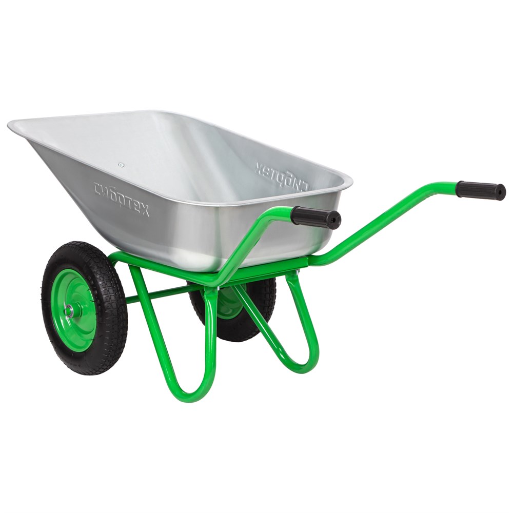 - Прочная конструкция — толщина стенок корыта и рамы составляет 0,7 мм и 1,2 мм соответственно, дополнительная опора кузова увеличивает грузоподъемность. Надежный кузов — борта корыта завальцованы для повышения его механической прочности. Антикоррозийная защита — стальное корыто оцинковано, а рама, опора и колесные диски покрыты порошковой эмалью. Удобное перемещение даже по неровной поверхности — пневмоколеса с камерами и резиновыми шинами повышают плавность хода, каждое имеет по 2 шариковых подшипника, облегчающих вращение и препятствующих износу. Ремонтопригодность — при необходимости колеса можно заменить, совместимые артикулы 68972, 68976, 689765, 68948, 689485, 68953, 68977, 689775.
