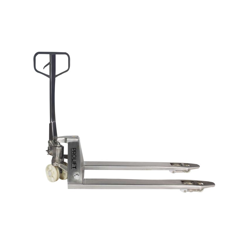 Тележка PROLIFT NG25 изготовлена из нержавеющей стали и предназначена для работы в агрессивных средах или помещениях с высокой влажностью: пищевых, химических, медицинских производствах, на холодильных складах, а также в помещениях с высокими санитарными требованиями. Грузоподъемность тележки — 2500 кг. Длина вил стандартная — 1150 мм. Конструкция выполнена из стального профиля высокой прочности, устойчива к скручиванию и деформации.