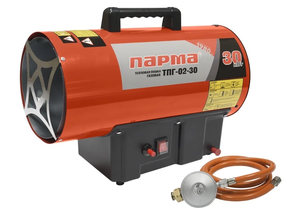 Газовая пушка Парма ТПГ-02-30 – воздухонагреватель прямого нагрева, работающий на газовом топливе. Топливо необходимо для получения горячей атмосферы в камере сгорания, а электроэнергия, подводимая к устройству, необходима для питания вентилятора, нагнетающего воздух, и для функционирования автоматики. Газовая пушка является простой и надежной конструкцией без дымохода, но горячий воздух и продукты сгорания из устройства поступают в помещение.