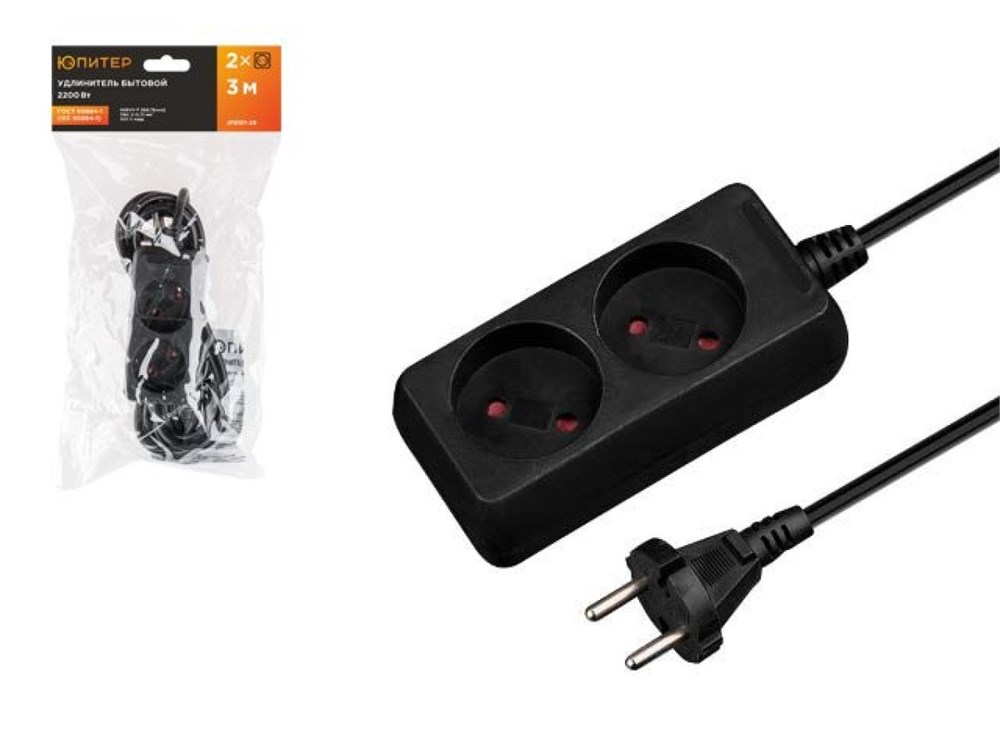 Удлинитель 3м (2 роз., 2,2кВт, б/з, ПВС 2х0,75) черный, Юпитер