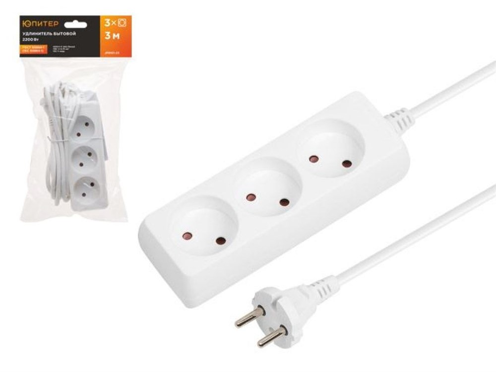 Удлинитель 3м (3 роз., 2,2кВт, б/з, ПВС 2х0,75) Юпитер