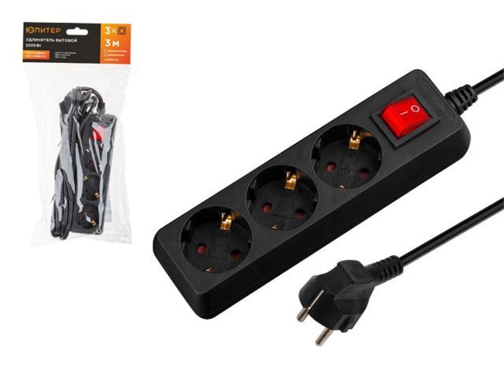 Удлинитель 3м (3 роз., 2,2кВт, с/з, выкл, ПВС 3х0,75) черный, Юпитер