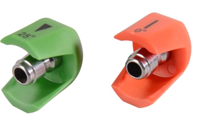Вторая форсунка зеленого цвета с углом распыления 25° применяется для эффективного смыва загрязнений и равномерного увлажнения поверхности. Благодаря своему углу разбрызгивания вода распределяется равномерно, что позволяет быстро и бережно очищать поверхность, не повреждая ее структуру.