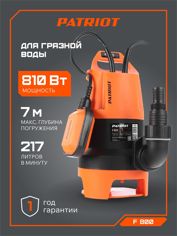Дренажный насос погружной для грязной воды PATRIOT F 800 для откачивания дренажных, дождевых и грунтовых вод. Допустимый размер частиц в загрязненной воде — до 35 мм. Будет полезен в процессе чистки сточных канав, дренажных колодцев, бассейнов, искусственных водоемов.