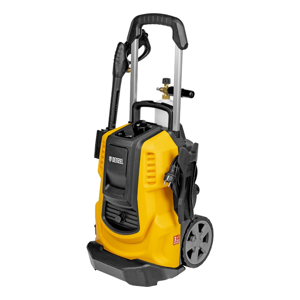 - Надежность — алюминиевая помпа со стальными плунжерами обеспечивает стабильное давление даже при длительной активной эксплуатации. Эффективное решение поставленных задач — 3 форсунки позволяют осуществлять распыление под углом 0, 25 и 40°. Удаление сильных загрязнений — в комплект поставки входит пеногенератор с улучшенной функцией пенообразования, латунным корпусом и увеличенным бачком для моющего средства объемом 1000 мл. Простая подготовка к работе — удлинитель пистолета с быстросъемным креплением позволяет легко изменить угол распыла, установив нужную форсунку, или перейти к использованию пеногенератора. Защита от засорения — фильтр воды для входного штуцера продлевает срок службы помпы. Простой уход — машина поставляется с иглой для прочистки форсунок. Продуманная конструкция — функциональный барабан для хранения шланга позволяет наматывать шланг без его отключения от мойки. Защита от непредвиденного запуска — производитель предусмотрел блокировку рычага моечного пистолета. Удобное управление — можно установить оптимальную величину давления при помощи кнопок и LED-дисплея. Контроль давления — манометрический выключатель останавливает насос при отпущенном рычаге пистолета, перепускной клапан предотвращает превышение допустимого рабочего давления. Термозащита — при перегреве двигатель отключается, что предотвращает выход моечной машины из строя. Увеличенная рабочая зона — длина шланга высокого давления составляет 8 м, кабеля — 5 м. Продуманное хранение насадок — они крепятся на корпус, поэтому всегда будут под рукой и не потеряются. Комфортное перемещение — предусмотрены транспортировочная ручка, выдвижная рукоятка и колеса. Гарантия 3 года — высокое качество техники подтверждено производителем.