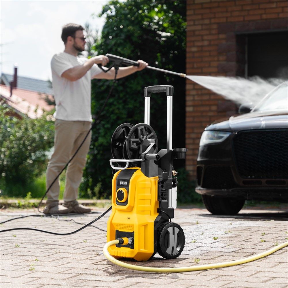 - Надежность — асинхронный двигатель устойчив к нагрузкам и не требует сложного обслуживания. Максимально эффективное очищение — к мойке прилагается внешний пенокомплект с функцией улучшенного пенообразования, быстросъемное крепление позволяет устанавливать его на пистолет одним движением. Выбор оптимального угла распыления — машина поставляется с 3 насадками: 0°, 25° и 40°. Быстрая подготовка к работе — быстросъемный адаптер упрощает подключение шланга подачи воды. Качественная фильтрация — посторонние частицы задерживаются на входе, что защищает помпу от поломки. Защита от случайного пуска — перед началом работы необходимо разблокировать рычаг моечного пистолета. Защита от превышения допустимого давления — машина оснащена перепускным клапаном, пневматическое реле останавливает насос при отпущенном рычаге пистолета и запускает после нажатия на курок. Термозащита — производитель предусмотрел датчик температуры, электродвигатель автоматически отключается при перегреве. Максимально комфортное передвижение — длина шнура питания составляет 5 м, длина шланга высокого давления увеличена до 8 м. Удобное использование — функциональный барабан подключен к магистрали высокого давления, поэтому вы можете разматывать и убирать шланг на барабан, не отсоединяя его от мойки. Степень защиты IPX5 — внутренние компоненты надежно изолированы от попадания воды. Мобильность — благодаря колесам и телескопической рукоятке машину удобно перемещать по участку. Несложный уход — в комплект поставки входит игла для прочистки сопла. Продуманное хранение — в конструкции предусмотрен кронштейн для кабеля, а также держатели для аксессуаров. Гарантия 3 года — надежность техники подтверждена производителем.
