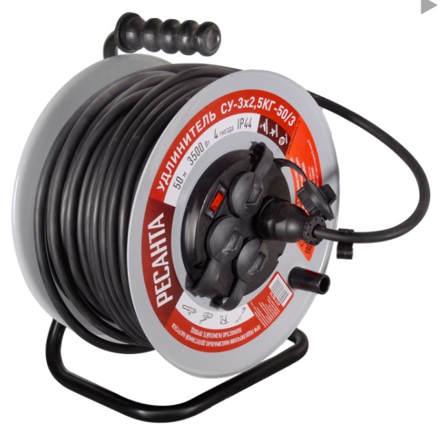 Удлинитель силовой на металлической катушке Ресанта СУ-3х2,5КГ-50/3 (с выкл., 4 розетки, IP44)