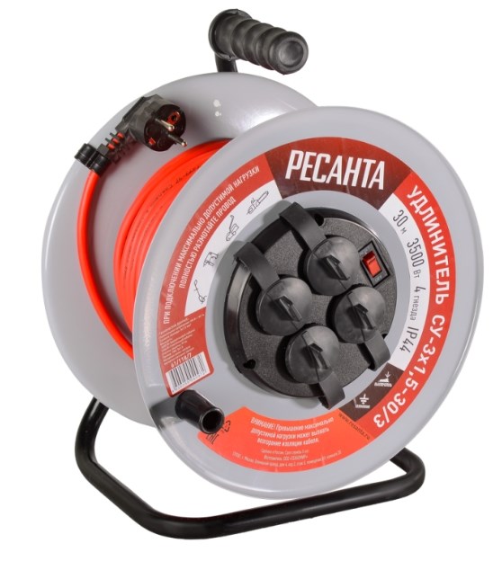 Удлинитель силовой на металлической катушке Ресанта СУ-3х1,5-30/3 (с выкл., 4 розетки, IP44)