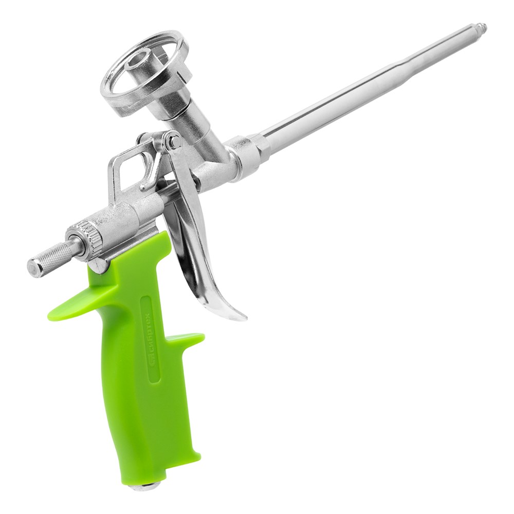 - Контроль скорости и объема выпуска монтажной пены — производитель предусмотрел трещоточный винт-регулятор.