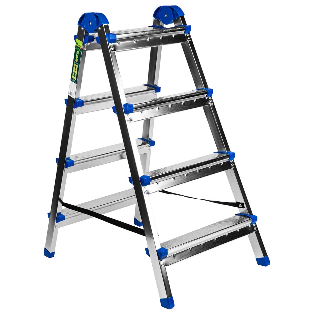 Стремянка двухсторонняя Сибртех 97984 со стальным профилем и 4 стальными ступенями помогает решать бытовые задачи на высоте, превышающей человеческий рост. Ее используют, чтобы доставать предметы с антресолей или шкафов, проводить уборку, менять лампочки, вешать полки или картины. Работать с электроинструментом на ней не рекомендуется. Стремянка с пластиковым складным механизмом повышенной стабильности и широким основанием очень устойчива на ровной поверхности. Площадка находится на высоте 88 см от опорной поверхности, рабочая высота стремянки составляет 288 см (при среднем росте пользователя 170 см).