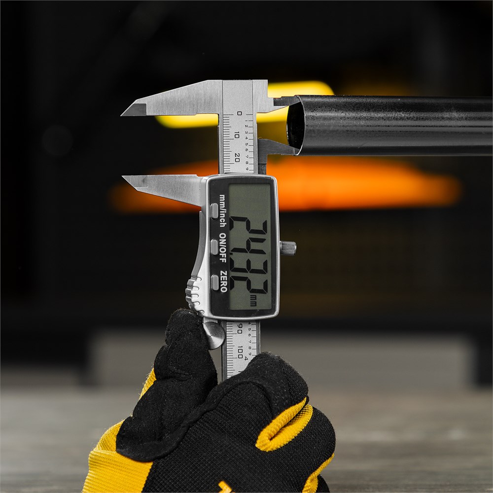 Прочность и долговечность — штангенциркуль изготовлен из нержавеющей стали. Высокая точность измерений — специальное колесико позволяет осуществить тонкую настройку, стопорный винт фиксирует губки в нужном положении, исключая их смещение во время работы. Безошибочное считывание результатов — полученные значения отображаются на большом цифровом LCD-дисплее. Два режима измерения — можно настроить отображение результатов в миллиметрах или дюймах. Готовность к работе — элемент питания CR2023 (3 В) входит в комплект поставки, его не нужно приобретать отдельно. Дополнительные возможности — глубиномер позволяет измерять глубину отверстий и канавок. Безопасная транспортировка и хранение — штангенциркуль упакован в прочный пластиковый кейс.