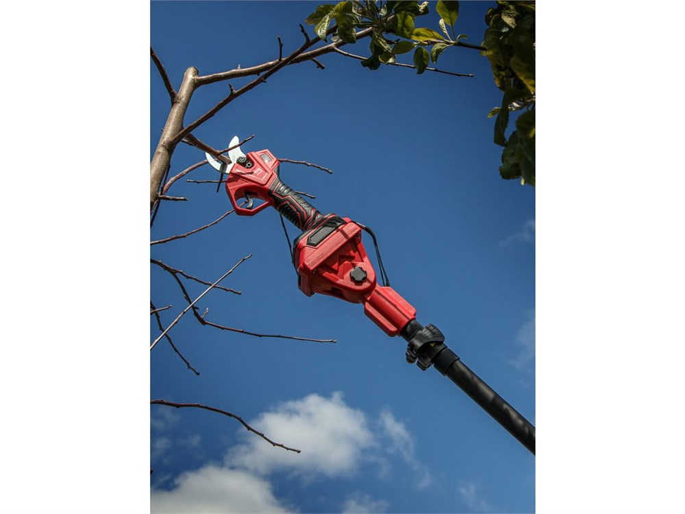 Аккумуляторный секатор идеально подходит для комплексного ухода за садом: обрезки ветвей кустарников и деревьев. Кроме того секатор обладает высокой режущей способностью благодаря острому ножу из твердой стали. Бесщёточный двигатель делает инструмент компактным и значительно продлевает срок его службы. К тому же для удобства пользователя предусмотрена трехпозиционная электронная регулировка толщины реза (до 28 мм). Прорезиненная рукоятка добавит дополнительный комфорт при работе. Имеет встроенный дисплей, отображающий процент заряда батареи. Обладает высокой скоростью работы, где один цикл занимает не более 1 секунды. Также модель совместима с телескопической штангой (идет в комплекте с изделием). Поставляется с телескопической штангой, аккумулятором и зарядным устройством.
