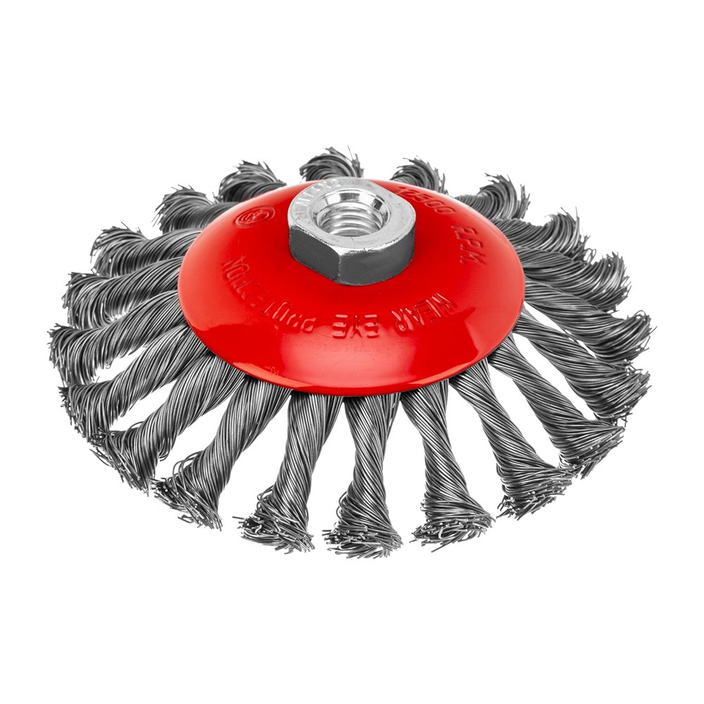 Щетка Matrix «тарелка» 74611 диаметром 125 мм, с щетиной из крученой проволоки толщиной 0,5 мм, устанавливается на УШМ при помощи гайки М14. Выполнена в форме тарелки, за счет чего подходит для грубой (черновой) обработки плоских и угловых поверхностей. Удаляет ржавчину, загрязнения, лакокрасочные покрытия, подходит для зачистки сварных швов. Использование на скорости до 12500 об/мин позволяет продлить срок службы насадки.