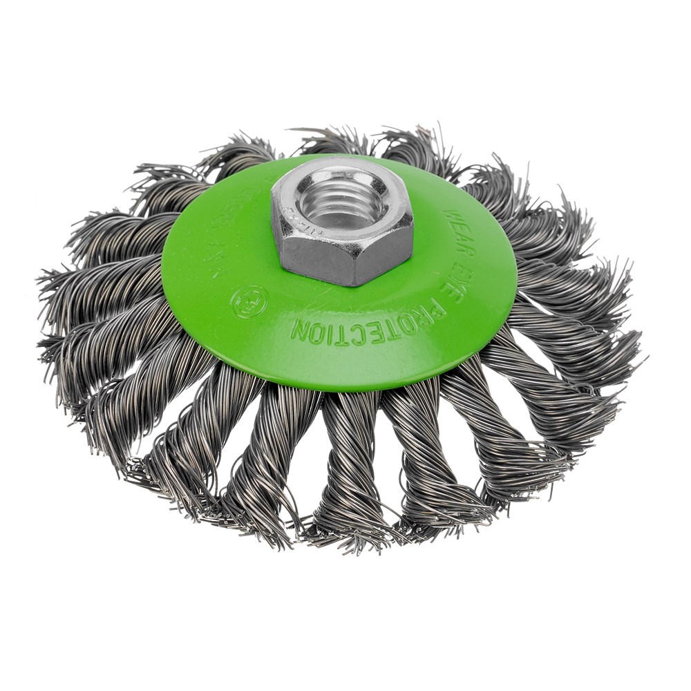 Щетка Сибртех «тарелка» 746097 диаметром 100 мм, с щетиной из крученой проволоки толщиной 0,5 мм, устанавливается на УШМ при помощи гайки М14. Выполнена в форме тарелки, за счет чего подходит для грубой (черновой) обработки плоских и угловых поверхностей. Удаляет ржавчину, загрязнения, лакокрасочные покрытия, подходит для зачистки сварных швов. Использование на скорости до 12500 об/мин позволяет продлить срок службы насадки.