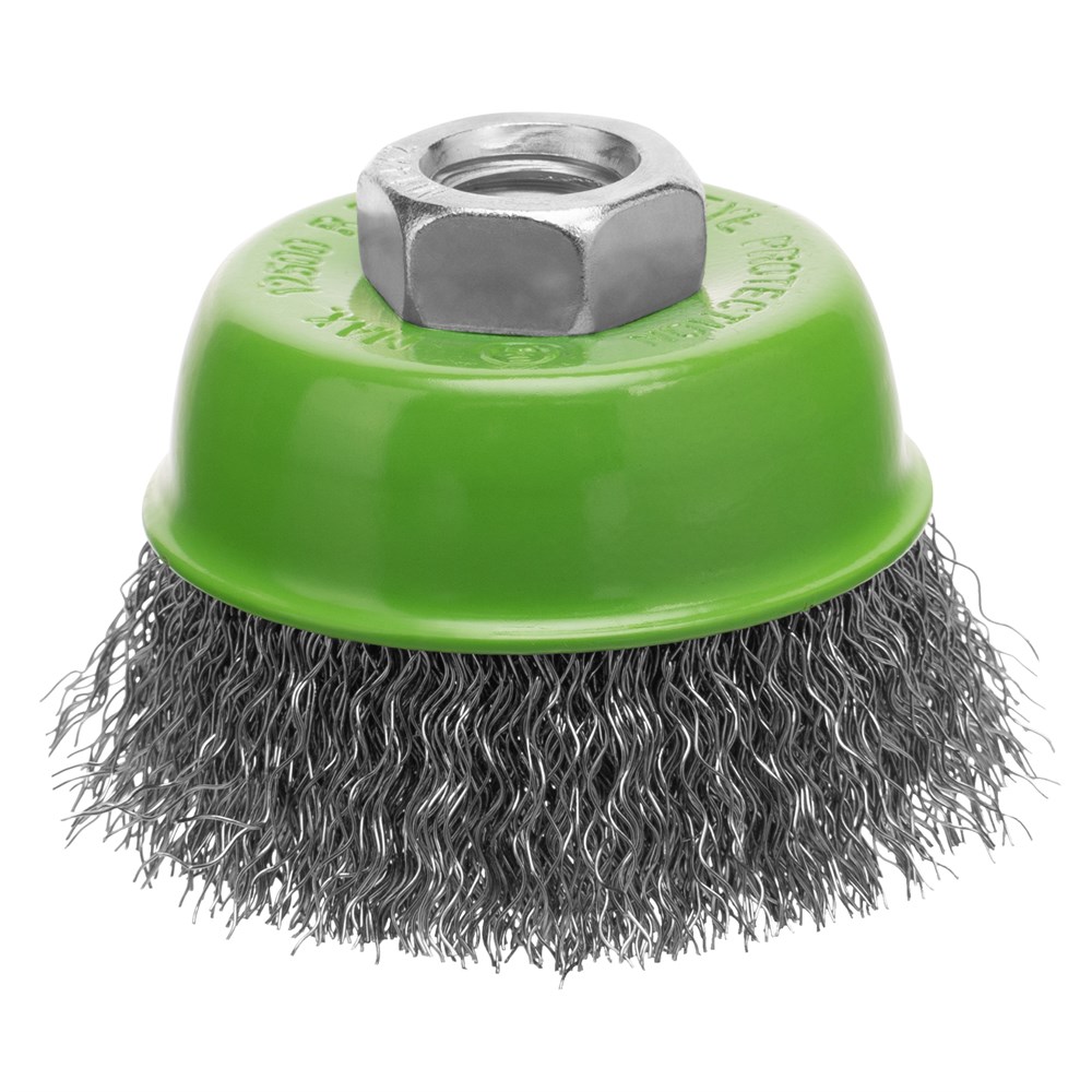 Щетка для УШМ Сибртех «чашка» 746037, М14, диаметром 65 мм, с щетиной из витой проволоки 0,3 мм, предназначена для постепенного снятия тонкого слоя материала с металлических, деревянных и пластиковых поверхностей. Удаляет ржавчину, загрязнения, а также остатки краски и других покрытий. Подходит для обработки участков значительной площади. Щетку устанавливают на вал углошлифовальной машины (УШМ), рекомендуемая максимальная скорость вращения 12500 об/мин. Работать с оснасткой следует в спецодежде.