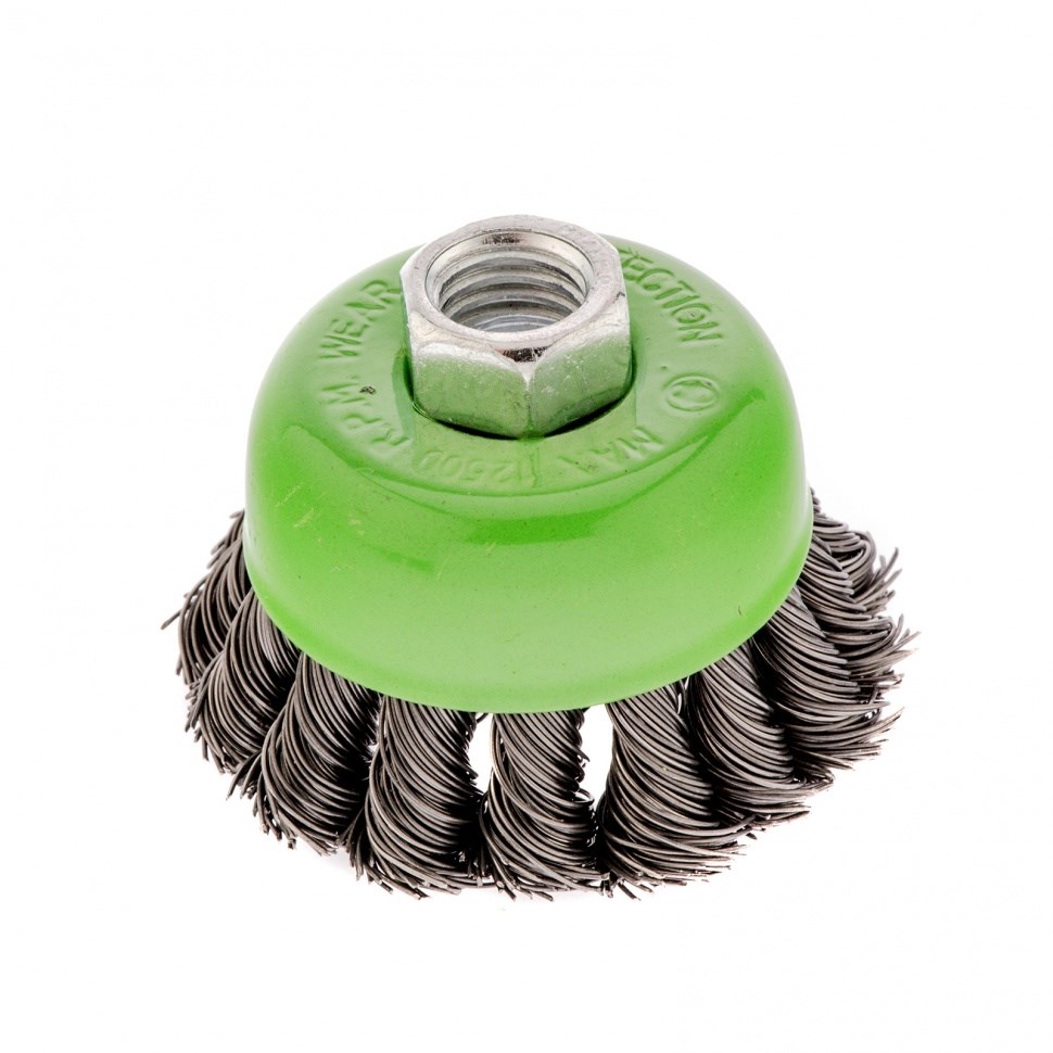 Щетка Сибртех «Чашка» 746207 диаметром 65 мм, с присоединительной резьбой М14, с щетиной из крученой проволоки диаметром 0,5 мм, устанавливается на УШМ, поддерживающую работу со скоростью 12500 об/мин. Изделие предназначено для грубой (черновой) обработки поверхностей и подходит для удаления загрязнений, снятия толстого слоя ржавчины, ЛКМ, зачистки сварных швов.