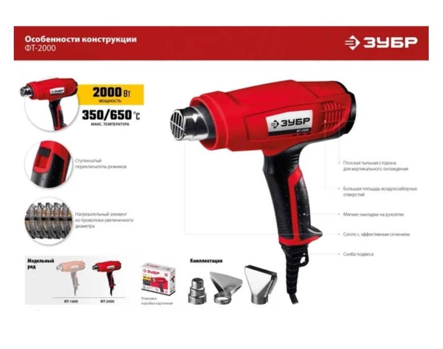 Технический фен ЗУБР ФТ-2000 представляет собой легкий и производительный инструмент для генерации воздуха. Используется при сушке и снятии лакокрасочных покрытий и строительных смесей (штукатурка, клей, гипс), размораживания труб, пайки и т.д.