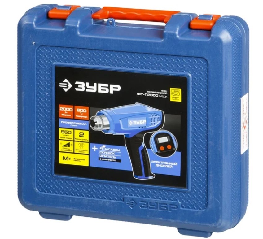 - Кейс - для удобства хранения и транспортировки технического фена Зубр ПРОФЕССИОНАЛ ФТ-П2000 М2ДК.