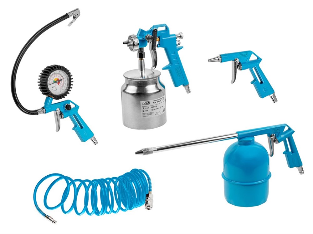Набор состоит из: - краскораспылитель типа HVLP с нижним металлическим бачком; - пистолет моечный для мойки поверхностей моющими составами; - пистолет для подкачки шин с манометром; - продувочный пистолет для очистки поверхностей от пыли и сухой грязи; - спиральный пневматический шланг для подключения аксессуаров к компрессору. Поставляется в картонной коробке.