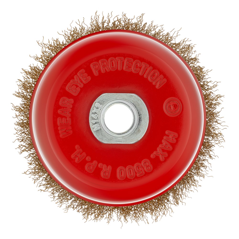 Щетка «чашка» Matrix 74605 диаметром 100 мм, с щетиной из латунированной витой проволоки, устанавливается на вал УШМ с помощью гайки М14. Предназначена для снятия тонкого слоя краски или лака, удаления ржавчины и загрязнений. При рекомендованной скорости вращения 8500 об/мин щеткой можно быстро обрабатывать участки большой площади.