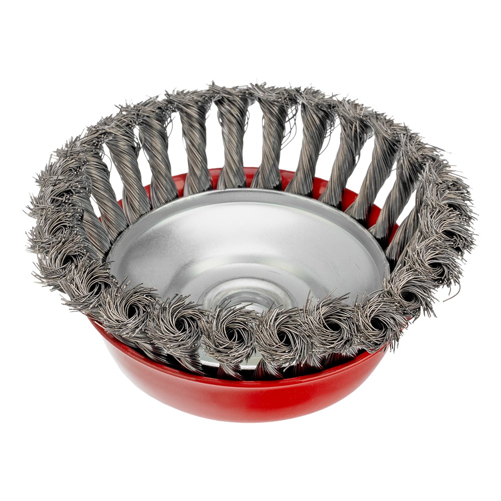 Щетка Matrix «Чашка» 74617 диаметром 125 мм, с присоединительной резьбой М14, с щетиной из крученой проволоки диаметром 0,35 мм, устанавливается на УШМ, поддерживающую работу со скоростью 6500 об/мин. Щетина предназначена для грубой (черновой) обработки поверхностей, менее агрессивной по сравнению с щетиной 0,5 мм. Изделие подходит для удаления загрязнений, снятия толстого слоя ржавчины, ЛКМ, зачистки сварных швов.