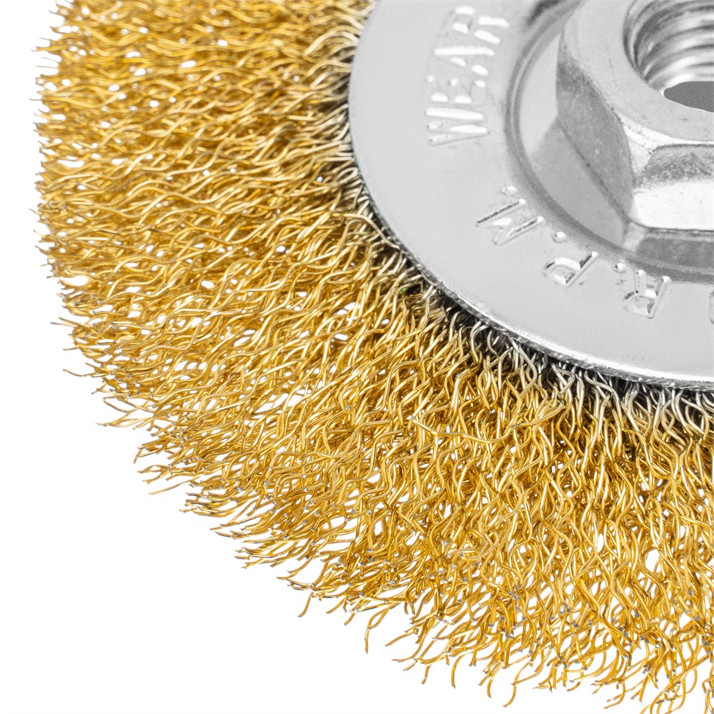 - Деформационная стойкость — витая проволока из стали хорошо держит форму даже при высоких нагрузках. Решение широкого спектра задач — оснастка подходит для обработки древесины, пластика, металлов, в том числе цветных, а также других материалов. Защита от разрушения — оцинкованный корпус и латунированная щетина устойчивы к коррозии.