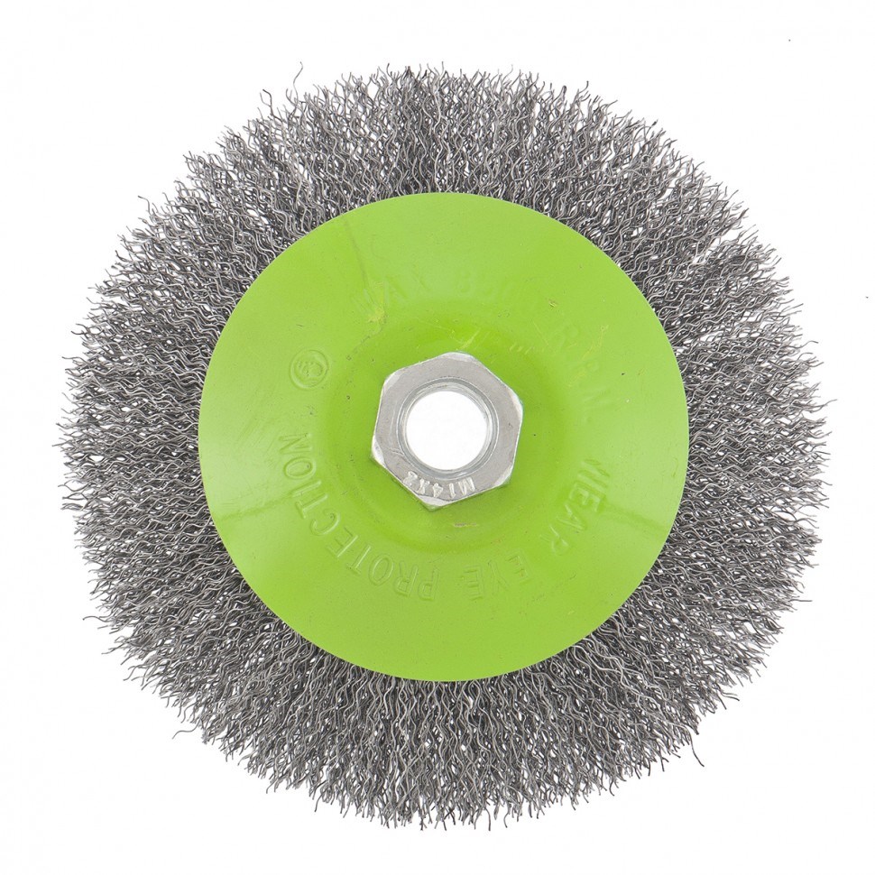 - Деформационная стойкость щетины — витая проволока принимает исходную форму после снятия нагрузок. Защита от коррозии — корпус покрыт эмалью, а на щетину нанесено техническое масло. Быстрая установка и замена насадки — щетка крепится на вал УШМ при помощи гайки М14.
