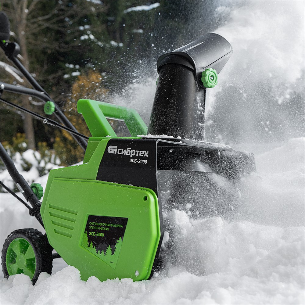 Электрическая снегоуборочная машина Сибртех ЭСБ-2000 97620 мощностью 2 кВт облегчит уборку территории после легкого снегопада. Работает от электрической сети, поэтому не производит шума и опасных выхлопов. Электродвигатель не требует сложного технического обслуживания.