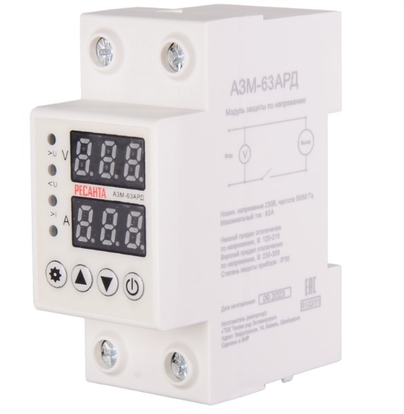 Блок защиты по напряжению Ресанта АЗМ-63АРД регулируемый (с дисплеем) — универсальный помощник для каждого дома, обеспечивающий комплексную защиту бытовой техники от разрушительного воздействия перебоев напряжения в электрической сети.